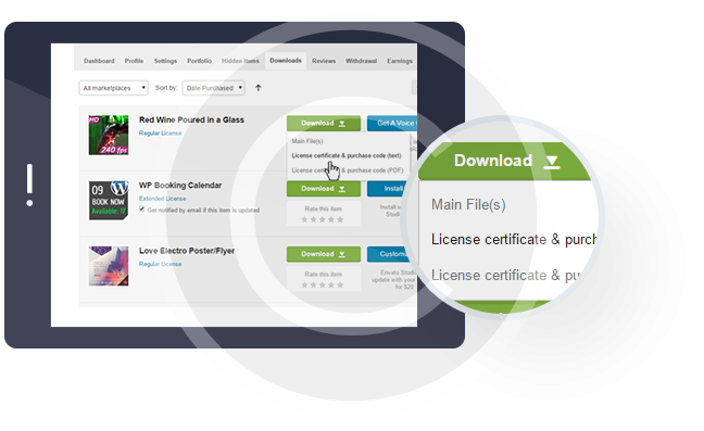 - Click “download” button, and in the drop-down menu select “license certificate & purchase code”.